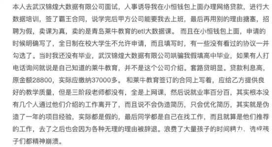 类似的还有,找工作以培训为名,背上几万贷款,最终以试用期没过为由被辞退。「我找工作,背上了37000元的贷款……」